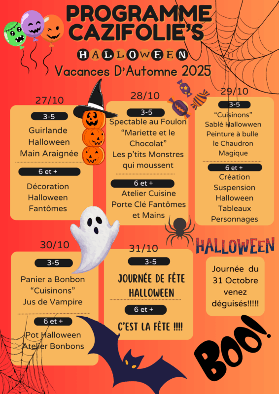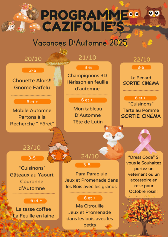 Voici le programme des vacances d’automne 2025, avec en thème les animaux de la forêt, activités d’automne et Halloween bien sûr !