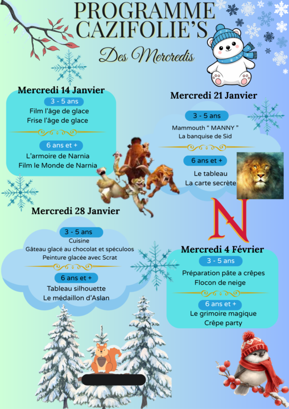 Avec le froid qui s’installe, les mercredis seront rythmés par des activités autour de l’Âge de glace pour les moins de 6 ans et sur Le monde de Narmia pour les plus grands.